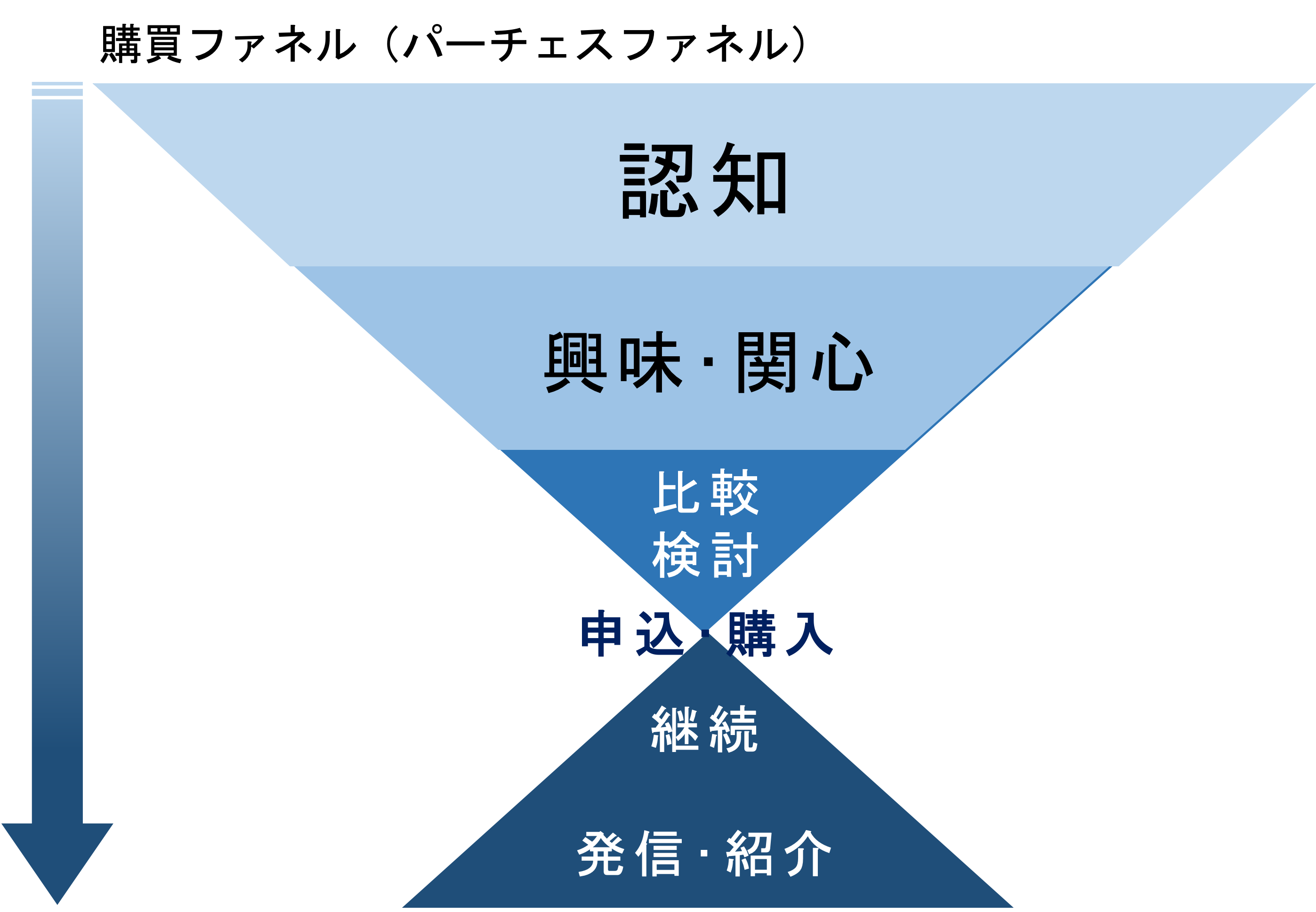 このThe Modelと一緒に覚えてほしいのが「購買ファネル」。ファネルとは「ろうと」。逆さの円錐形で、液体を注ぐのに入り口を広く、出口を狭くしたあれですね。これもまた、大きな入り口は「認知」から始まり、「興味・関心」「比較検討」を経て「申込・購入」に至ります。そして、その顧客が購入・利用を続けてくれる、さらには自ら発信したり推奨してくれるなら言うことなしです。