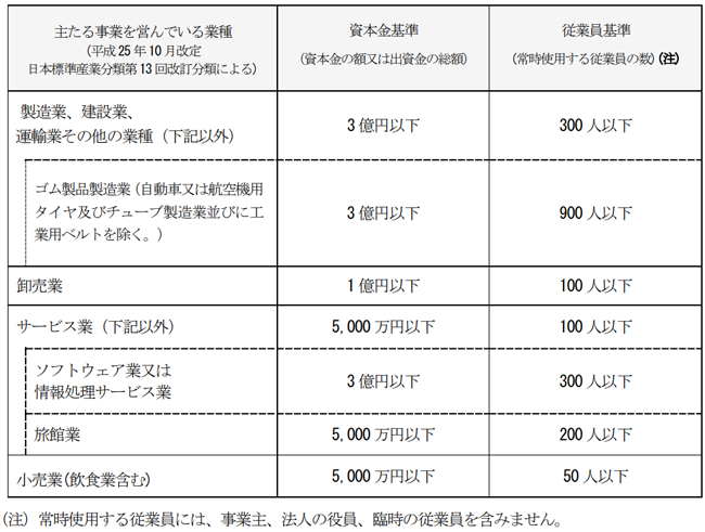 個人の事業主または会社で、下表の「資本金の額」または「従業員数」のいずれかに該当する方で、東京都内に主たる事業所を有する(本社若しくは支店登記がされている)方が対象となります。