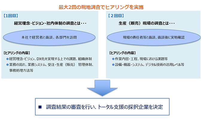 専門家が現地訪問し、経営ビジョン、DX化を実現する上での課題等を確認し、支援方針を決定します。