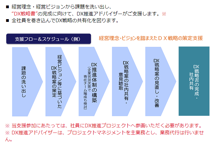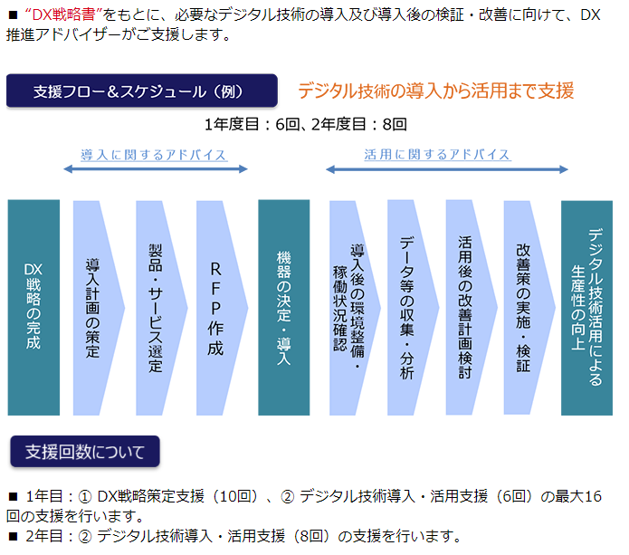 ①DX戦略策定支援(最大10回)② デジタル技術導入・活用支援(2年間で最大14回)に分かれています。
