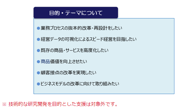 本事業は、都内中小企業がデジタル技術を用いて企業変革を図ることで新たな価値を創出し、継続的な成長・発展を目指していくことができるよう、DX戦略の策定やICT、IoT、AI、ロボット等のデジタル技術の導入検討から活用までを一貫して支援するものです。