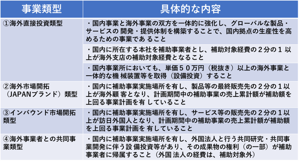 2020年に「グローバル展開型」という、補助金の新しい類型ができました。ただ、実際には使いづらい点があったため、令和4年度の第14次申請より下記のように変更されています。