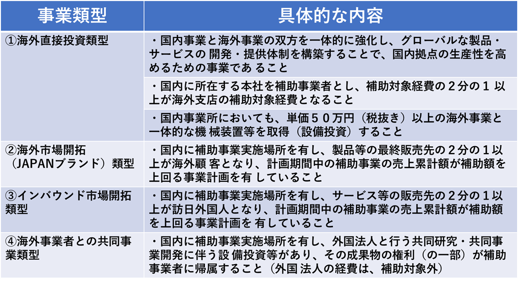 特に②海外市場開拓(JAPANブランド)類型が、使いやすく変更されました。