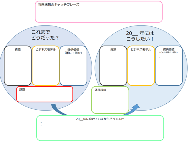 いずれの雛型も構成は、①上の枠と②右の枠、③左の枠、④下の枠の4つです。②右の枠と③左の枠には、それぞれ、(1)提供価値、(2)ビジネスモデル、(3)資源の枠が入っています。KDSの思考の特徴は、(1)から(2)、(3)へと考えていく(バックキャスト)ところです。(1)資源にとらわれることなく、顧客への(3)提供価値を考えていくことによって、真の価値創造を行うことを意図しています。