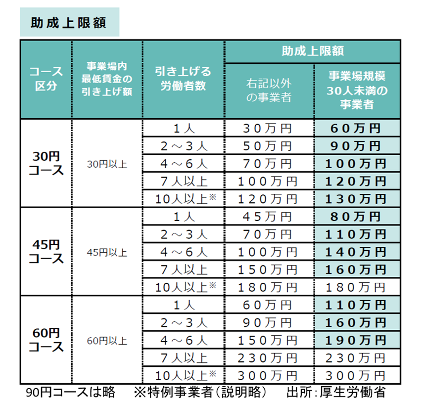 助成金額は、企業が行う賃上げの額に応じた「コース」によって決まり、それぞれのコースにおいて、対象となる労働者の人数に応じて助成の上限額が設定されています。