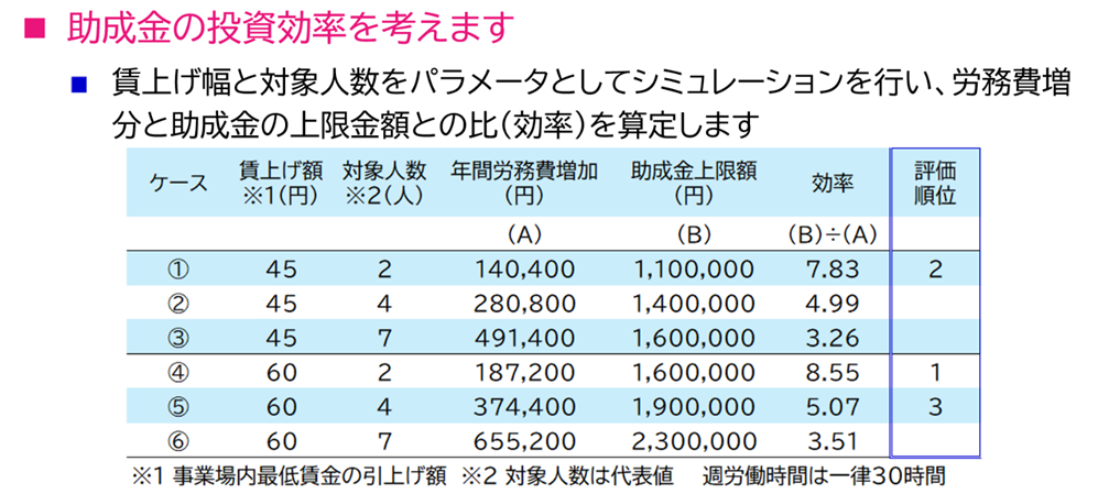 また、助成金の上限額はコースごとに設定されており、対象となる賃上げ労働者の人数によって異なります。年間の労務費増加額に対して、受け取れる助成金の割合(投資効率)を分析することで、最も合理的な申請方法を選択できます。
