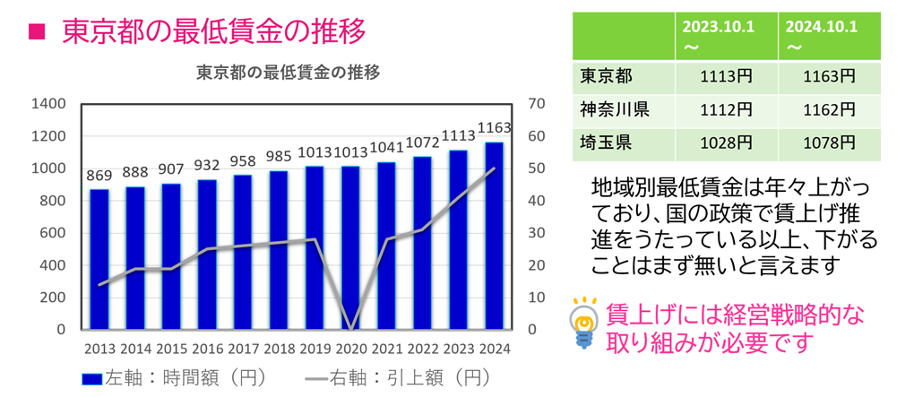 9月30日までは既存の最低賃金が適用されますが、10月1日からは新しい最低賃金が適用されるため、企業はこの変化に対応する必要があります。報道などで耳にされているかと思いますが、最低賃金は国の政策として引き上げが推進されており、今後も引き下げられることはほぼ考えられません。