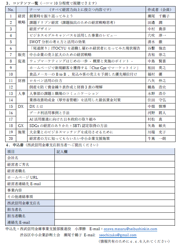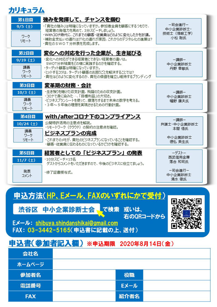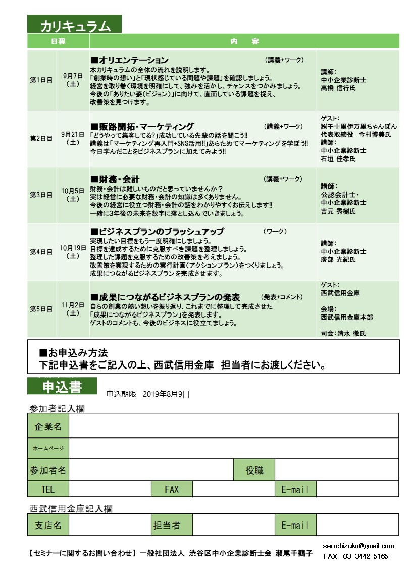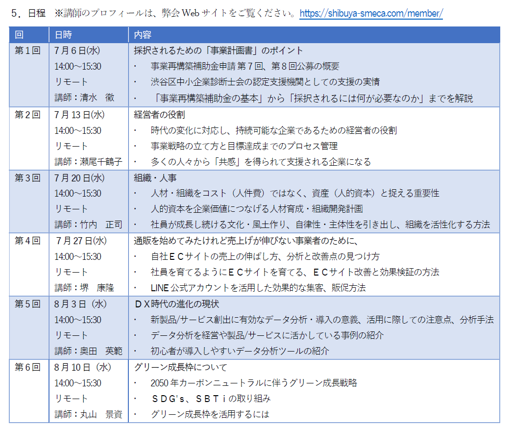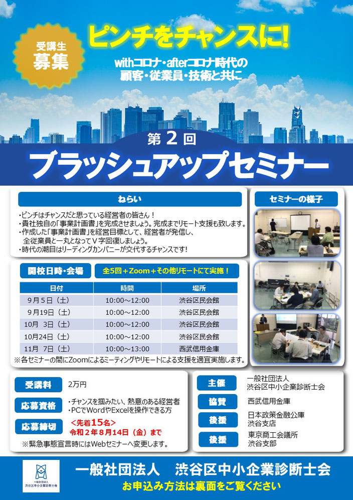 創業5年目までの経営者様を対象として、中小企業診断士会の講義、伴走型で「事業計画書」を作成し、最後にプレゼンするといったセミナーです。