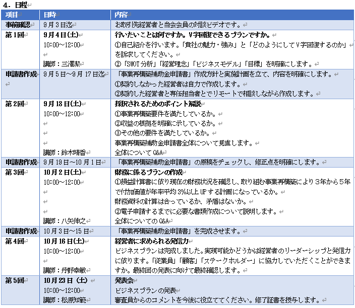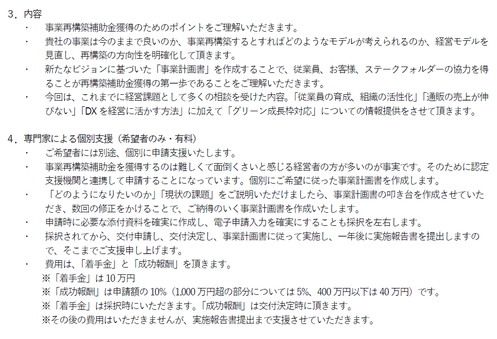 補助金を活用されたい経営者様を対象として、中小企業診断士会の講義、伴走型で「事業計画書」を作成し、最後にプレゼンするといったセミナーです。